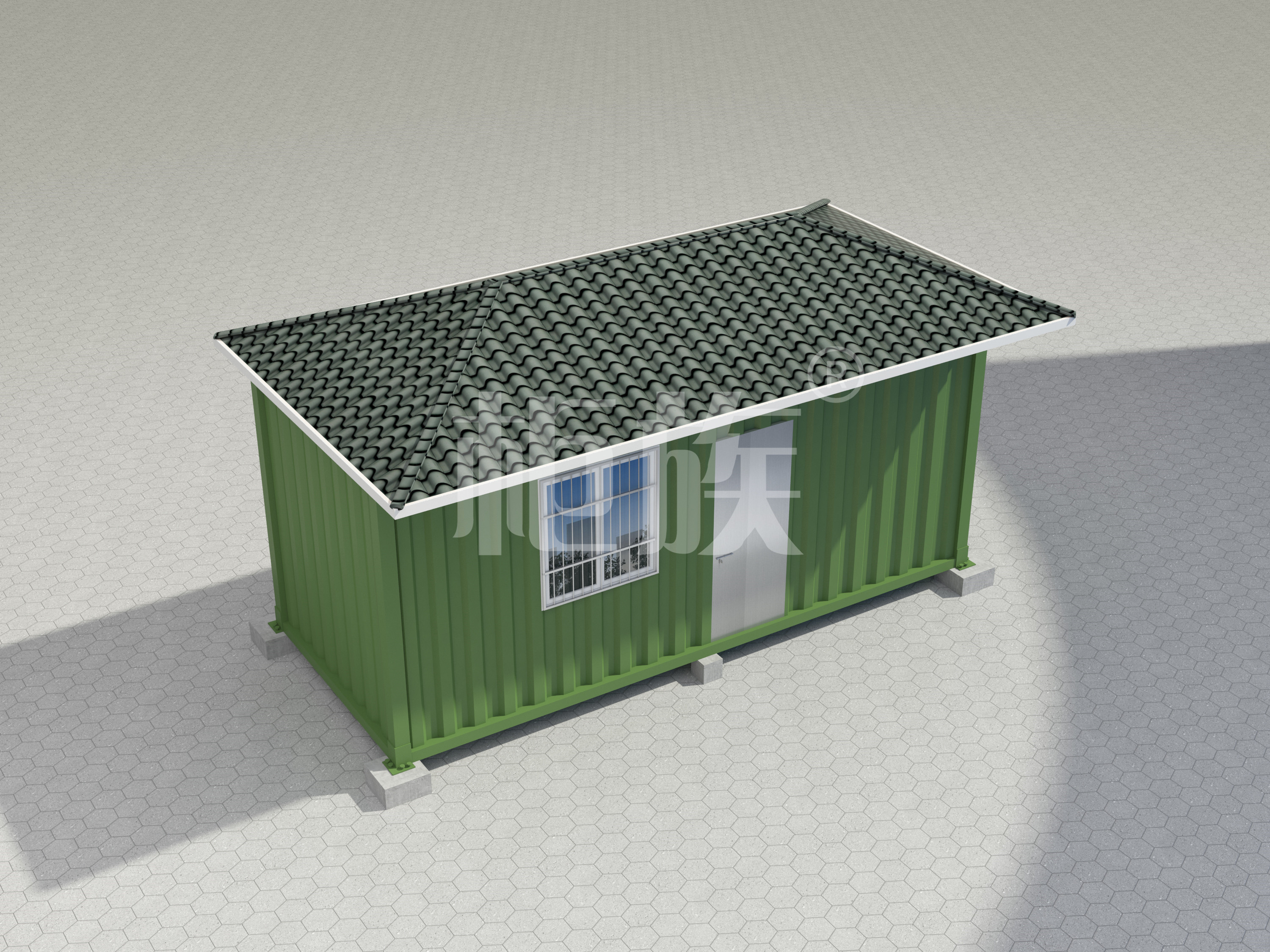 Galvanized rectagular steel tube frame, asphalt tile pitched roof, simply decorated wall. It is beautiful in appearance, good in windproof and moisture-proof, and can be used by fishpond breeding staff.
